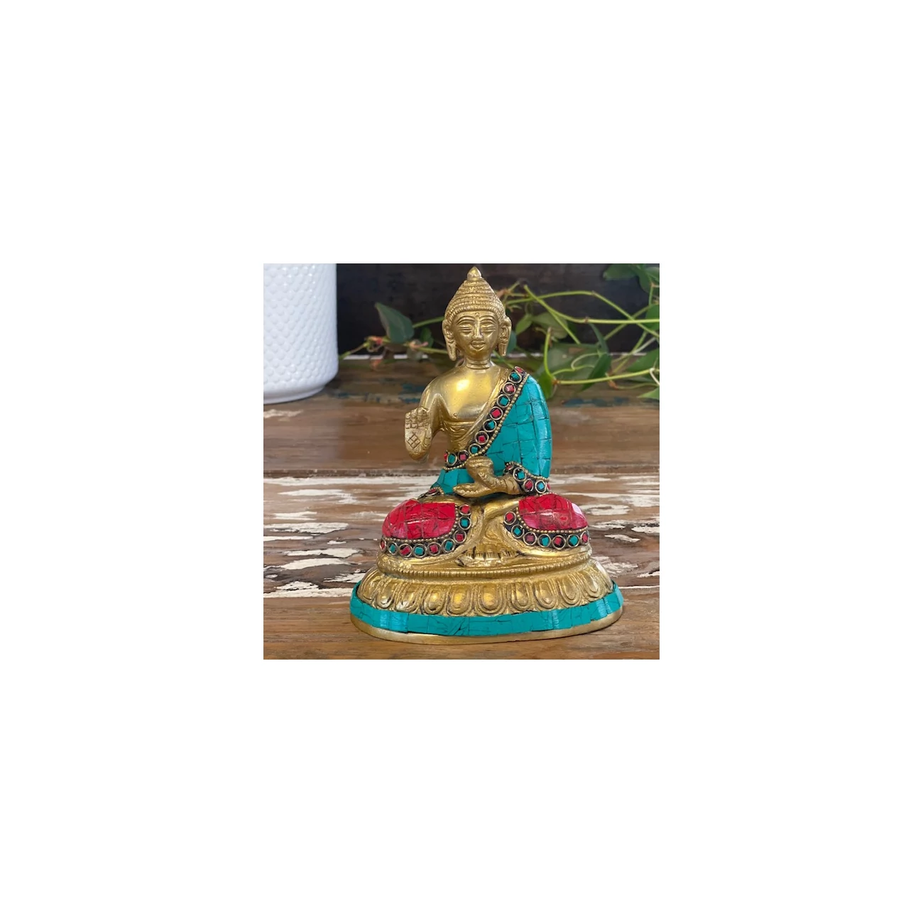 Részletesen kidolgozott, réz, díszítő köves berakásos Buddha szobor Indiából. 15 cm, keze áldás osztó mudrában. Keleti kultúra kedvelőinek szép ajándék lehet.