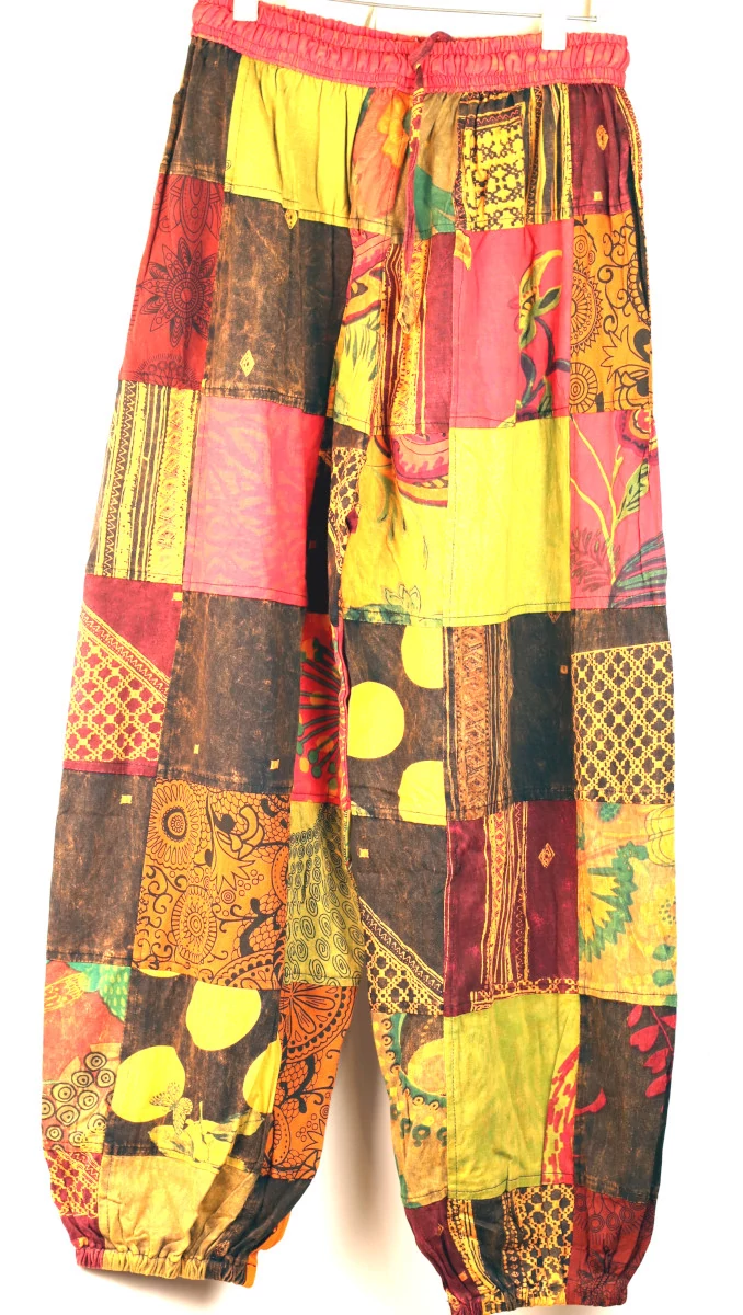 Pamut anyag. Egyszeresen kihúzva a dereka 47 cm, hossza 113 cm. Bokánál is gumis. Változatos élénk színekből tevődik össze.