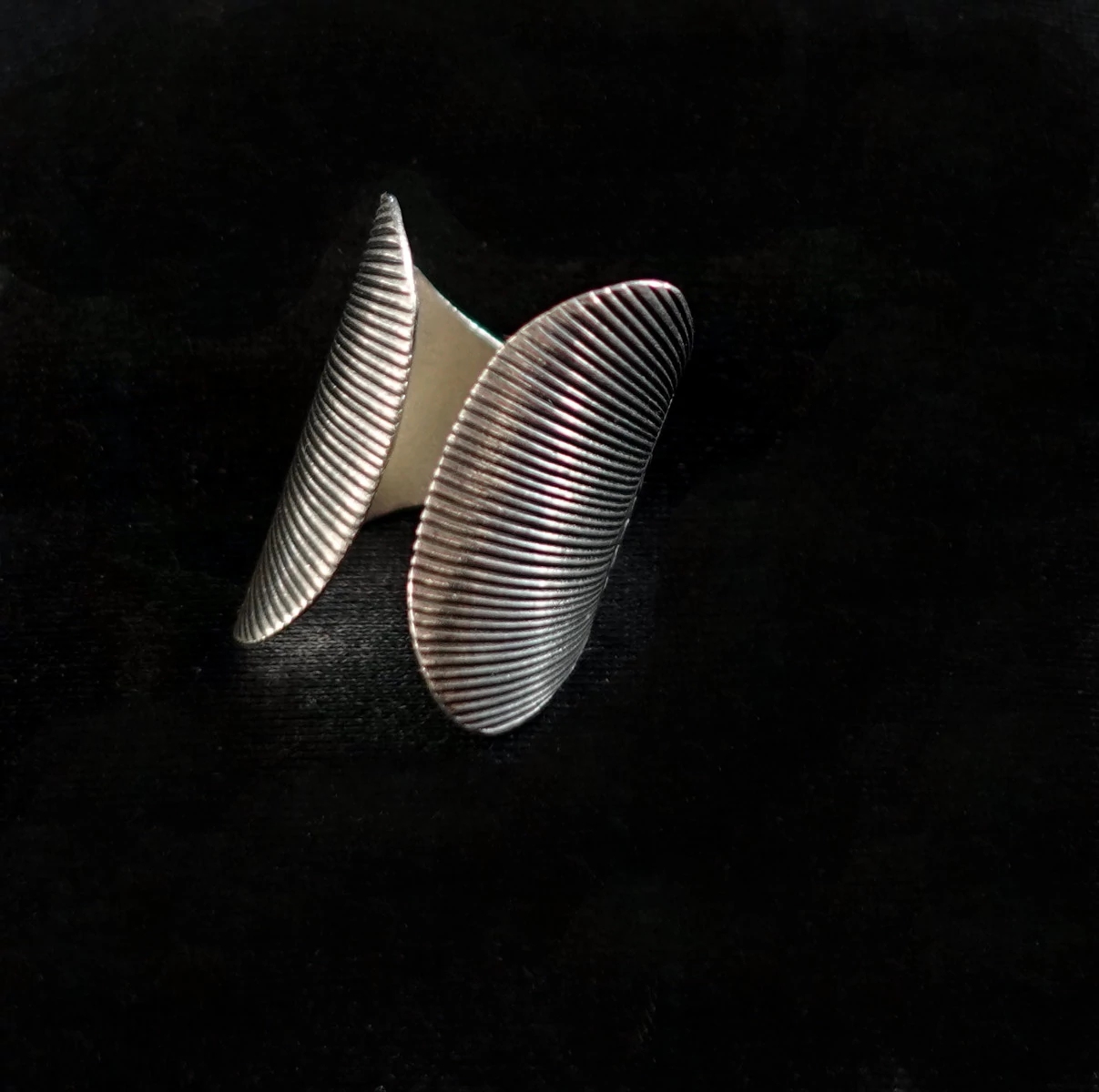 Hill Tribe törzsi kézzel készített, fémbélyegzéses ezüst gyűrű. 3 cm. széles. 925-ös jelzéssel. Mérete állítható. Csak 1-1 darabszámú, limitált bemutató kollekció darabja.
