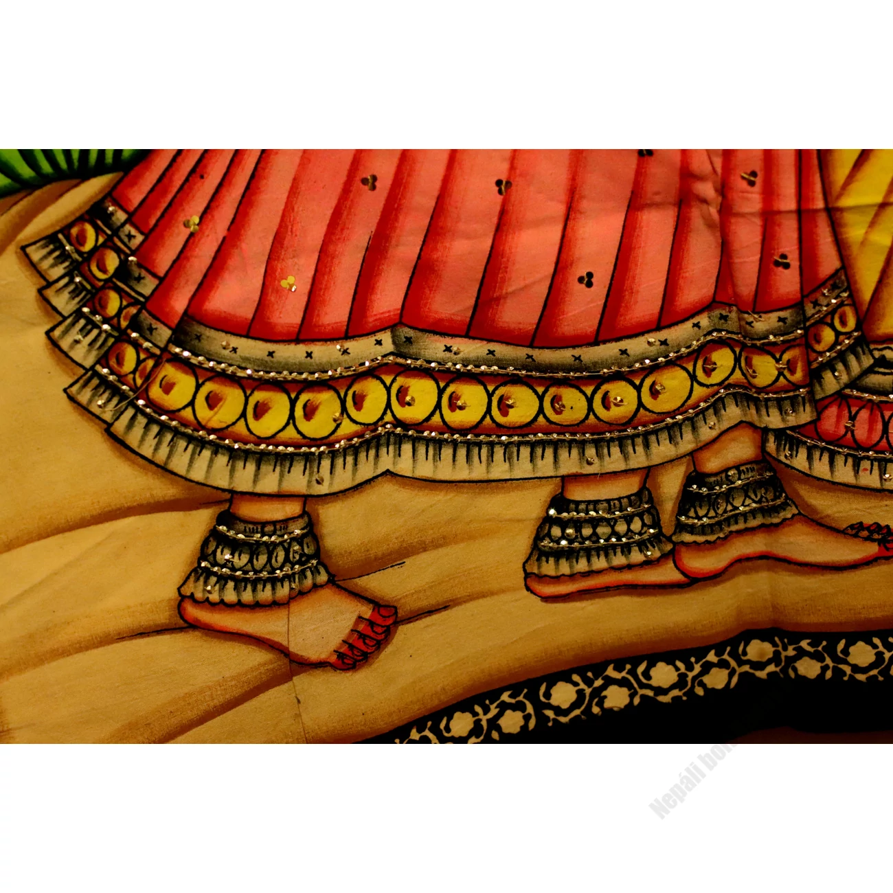 Festett tradicionális indiai kézimunka. A fotón sajnos nem látszik, de csillogó flitterekkel, gyöngyökkel gazdagon díszített, hogy magához vonzza a fényt.  Anyaga: pamutvászon. Méretei. 120* 90 cm.