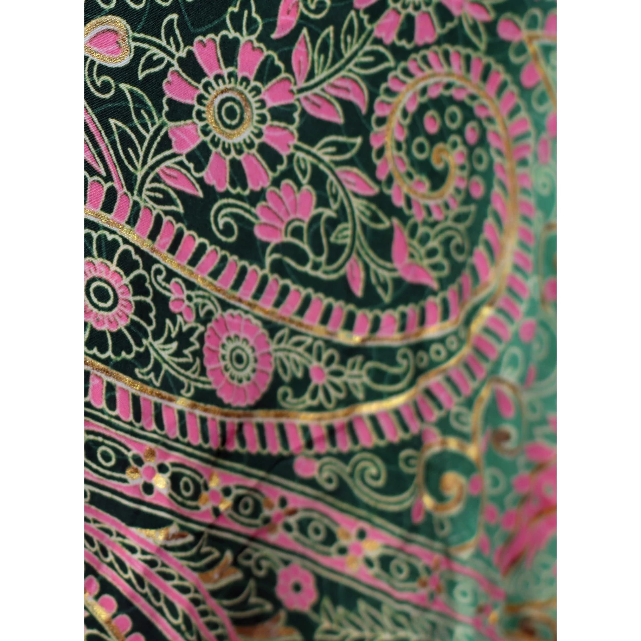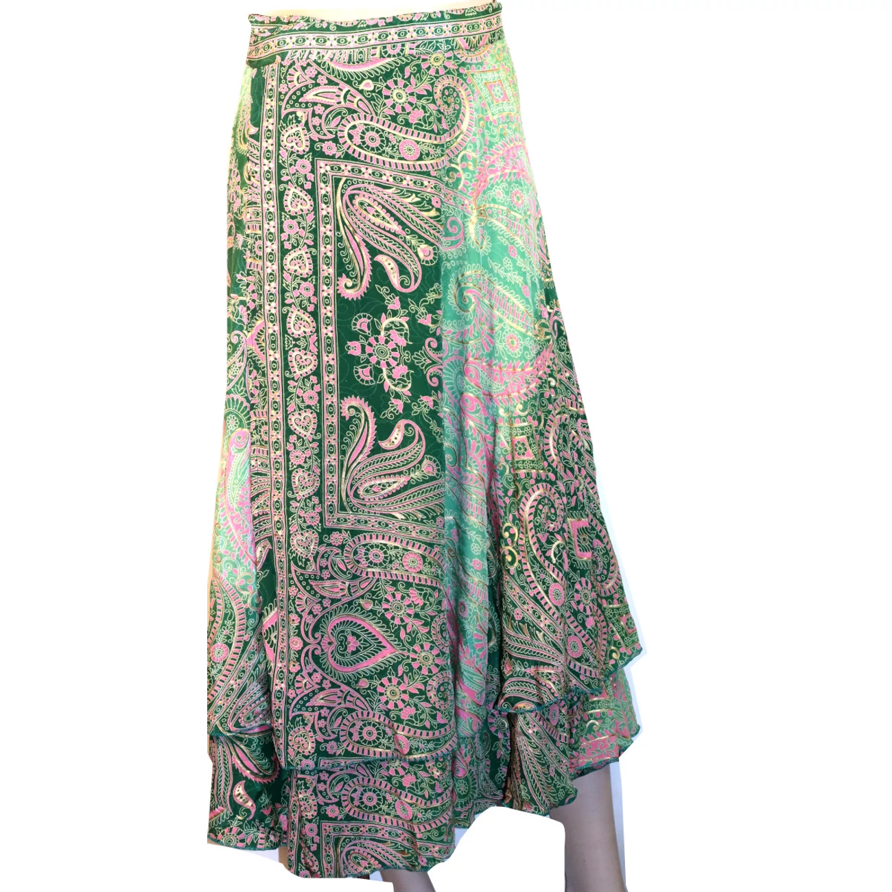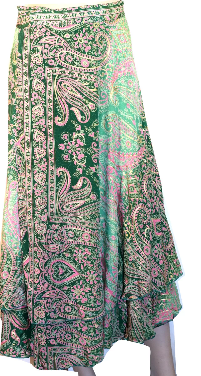 Indiai jellegzetes lapszoknya gyönyörű színekben és mintában. Anyaga selyem, a minták arany kiemeléssel, finom szári anyag. A hossza 90-100 cm.