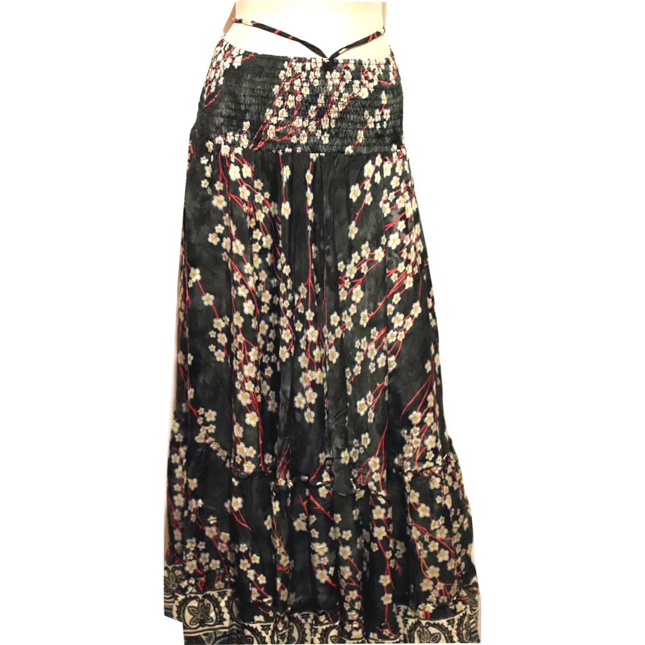 Indiai szoknya gyönyörű színekben és mintában. Anyaga selyem, finom szári anyag. Jellegzetessége, hogy ruhaként is hordható. Dereka gumis. A hossza 100-107 cm.